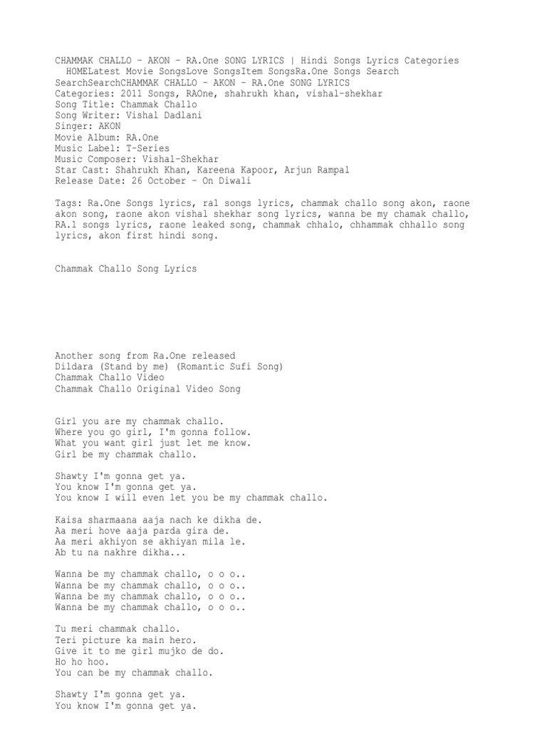 Chammak Challo Akon Ra One Song Lyrics Hindi Songs Lyrics Bollywood Film Production Districts