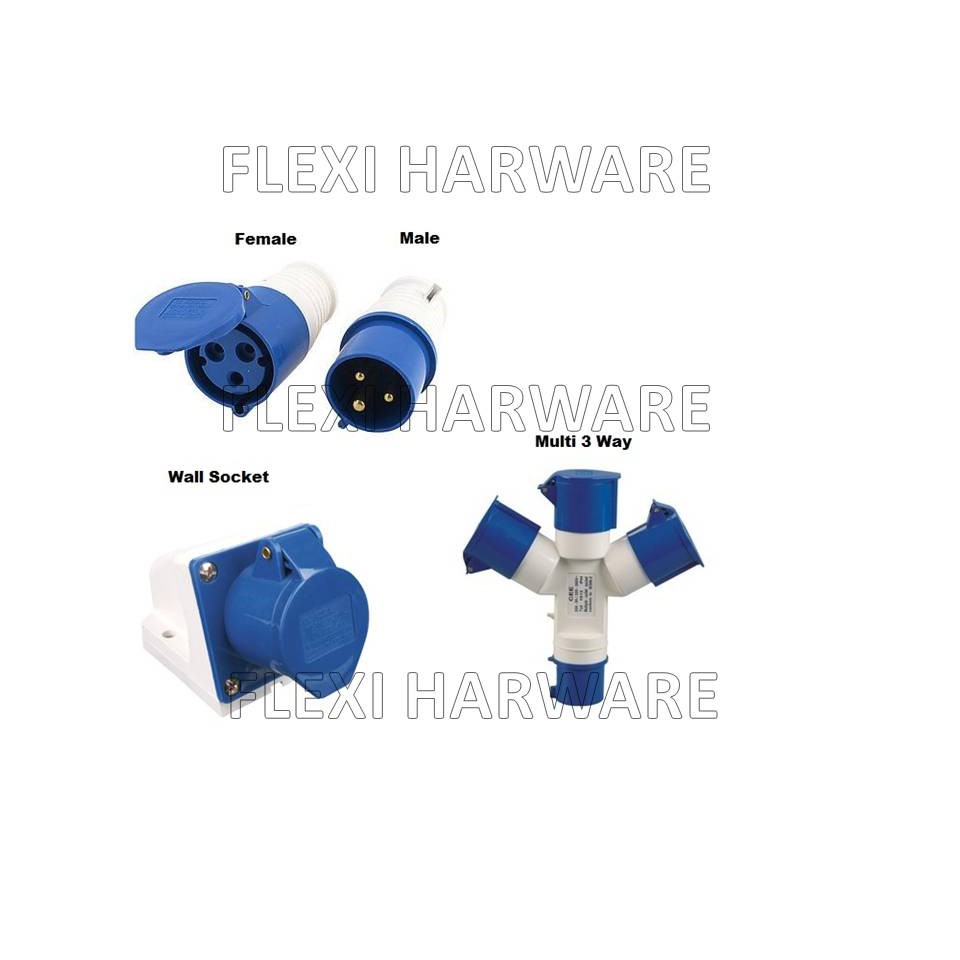 240v 16a 3pin Blue Industrial Plug Sockets Ip44 Weatherproof Male Female Ebay